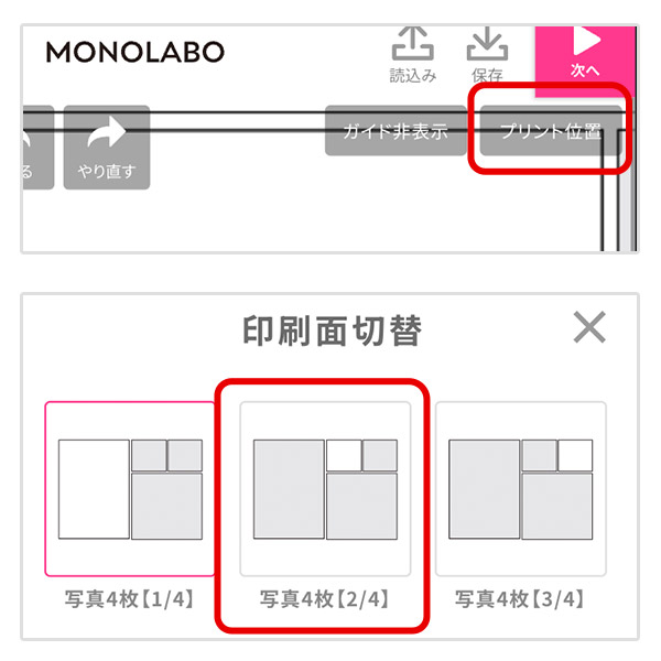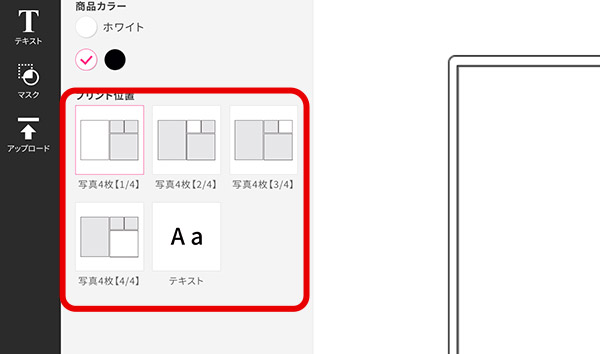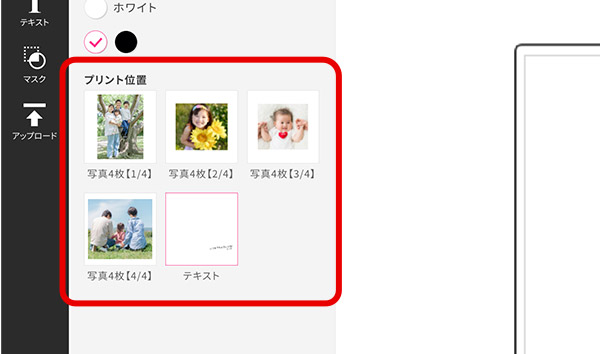 「プリント位置」から写真を配置するエリアを選びます