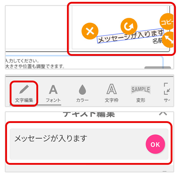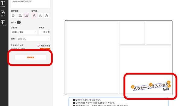 あらかじめ配置してある編集したいテキストを選び「文字編集」をクリックします。