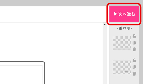 全ての「プリント位置」に写真を配置し、メッセージの編集が完了したら、「次へ進む」をクリックします。