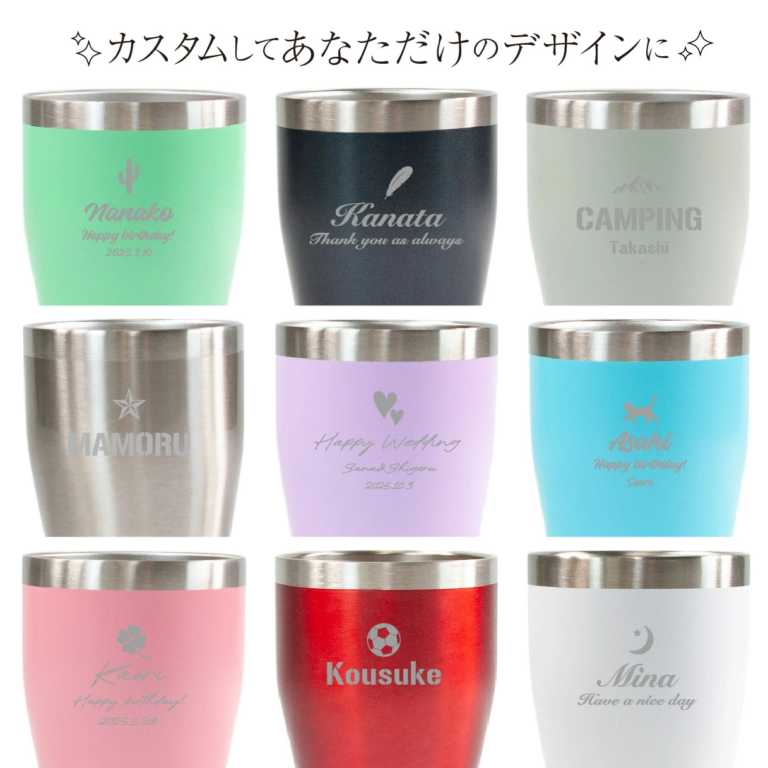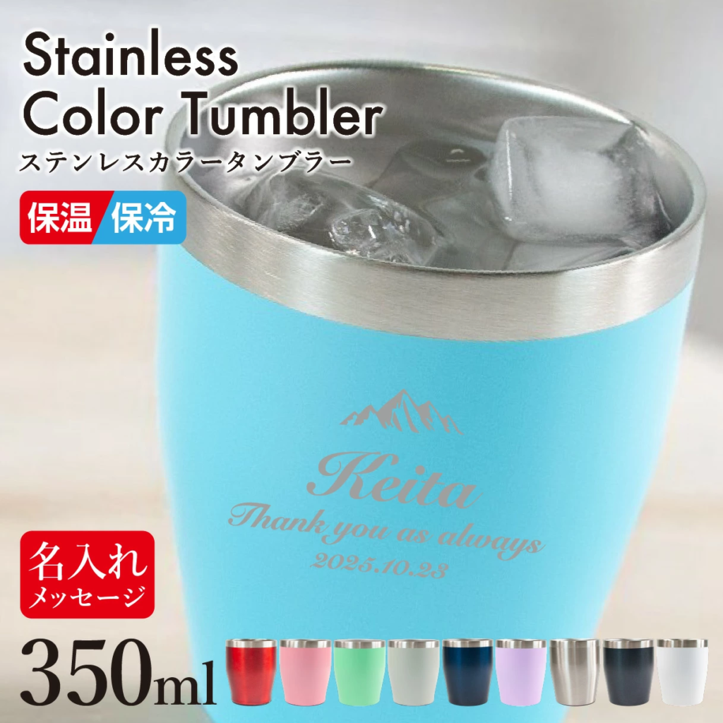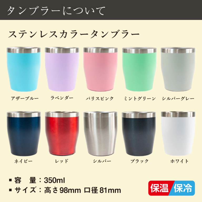 10色のカラーから選べる名入れタンブラーです。マークやメッセージでカスタマイズしてオリジナルタンブラーを作ろう。温かい飲み物も冷たい飲み物も適温をしっかりキープします。