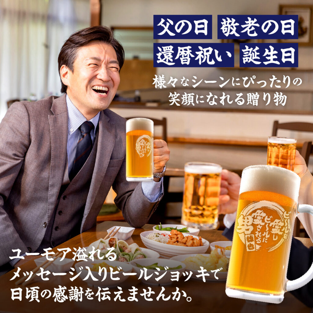 父の日、誕生日、還暦、敬老の日などのプレゼントに!おもしろメッセージビールジョッキ 435mlサイズ。名入れもできます!