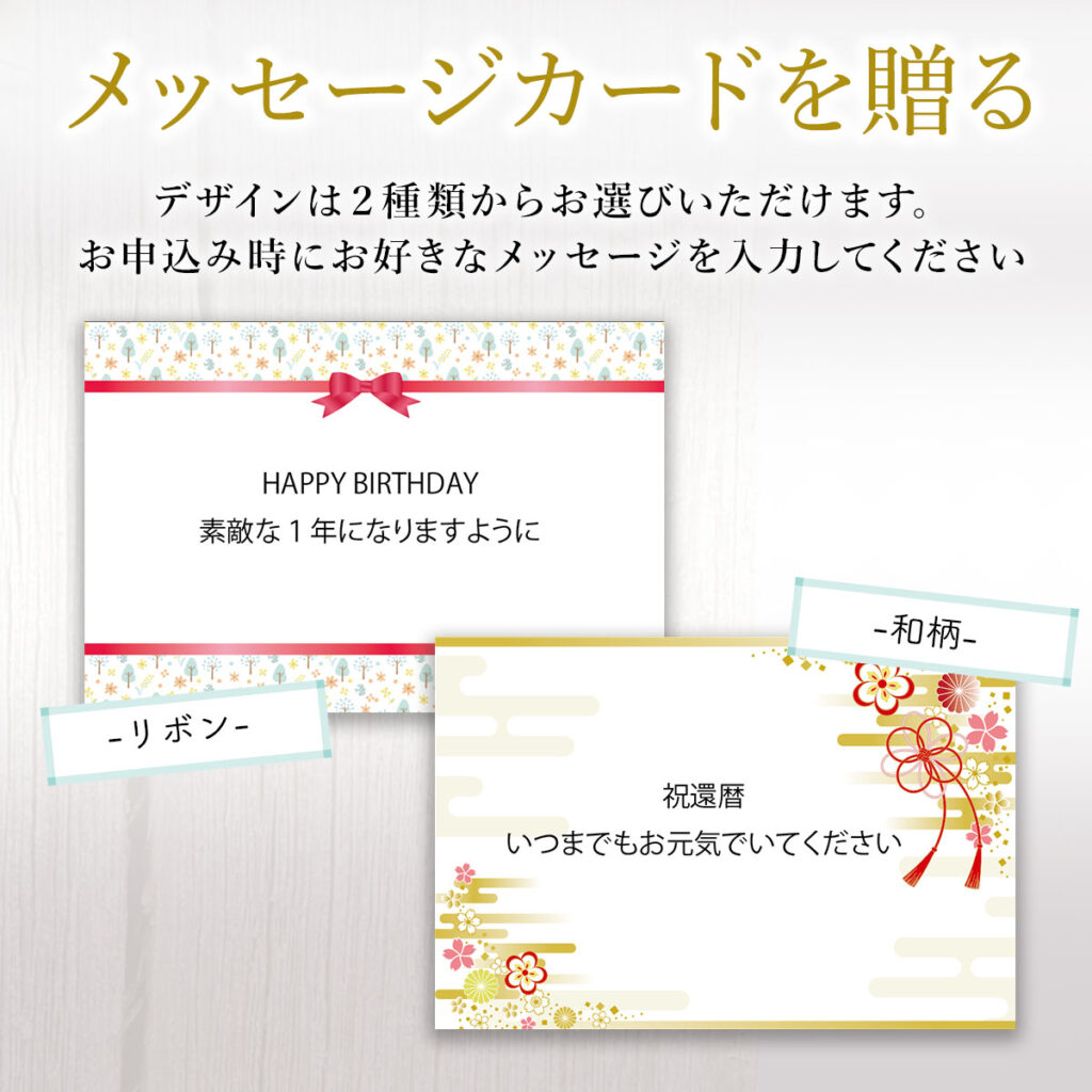 | ご利用されることの多いイベント | 還暦 (かんれき) 60歳 、古希 (こき) 70歳 、喜寿 (きじゅ) 77歳 、傘寿 (さんじゅ) 80歳 、米寿 (べいじゅ) 88歳 出産祝い、出産内祝い、結婚祝い、結婚内祝い、卒業祝い、入学祝い、就職祝い、成人祝い、定年祝い、送別祝い、バレンタインデー、母の日、父の日、クリスマスなど |