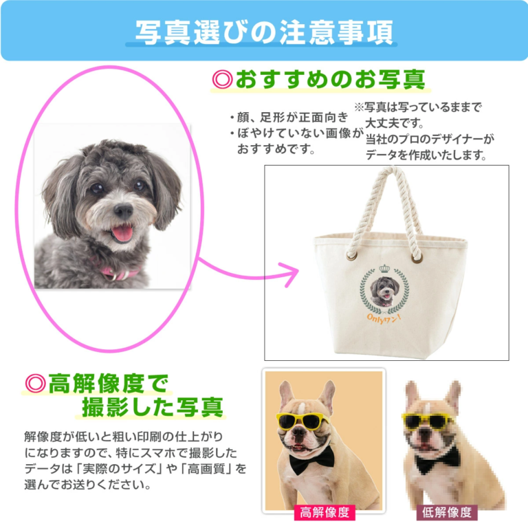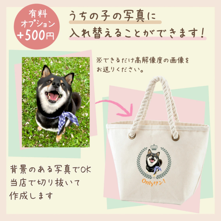 オプションで写真を変えることもできます!写真をスマホで送るだけで、オリジナルエコバッグが作れちゃう