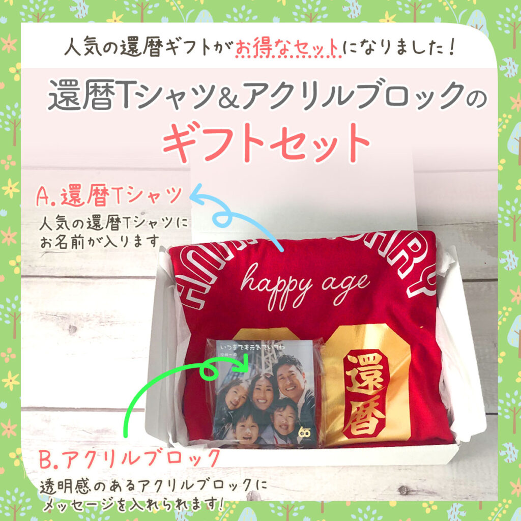 人気の還暦Tシャツとアクリルブロックをギフトセットにしました。世界にひとつだけのオリジナルギフトセットはいかがでしょうか?